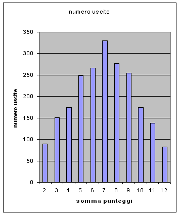 Each one of us threw 100 times a couple of dices, then we put them together with EXCEL and we did a graph: here it is what we obtained, a sort of bell; number seven results to be more probable  then the other numbers; the probability decreases with smaller and bigger numbers.