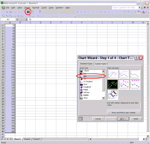 Step 2. Click the Chart Wizard icon. Then select Line as chart type.
