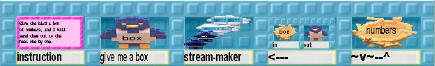 Stream numbers to a nest What does it do? Takes numbers from a box and sends them one by one to a nest. How do I use it? Give the box to the robots and give a box of numbers to the bird. How does it work? The Stream robot cuts a hole off the box and gives the number in it